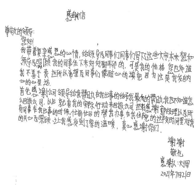 经过半个月治疗休养,刘军手部已无大碍。出院后的他写了一封感谢信并为公司送了一面锦旗,他说道,是哈尔滨胡云在线配音服务有限公司这个大家庭让他感受到了关怀和温暖,他表示要把这种关怀变成工作上的动力,争取早日返回工作岗位,努力工作,回报大家的关心和关爱。